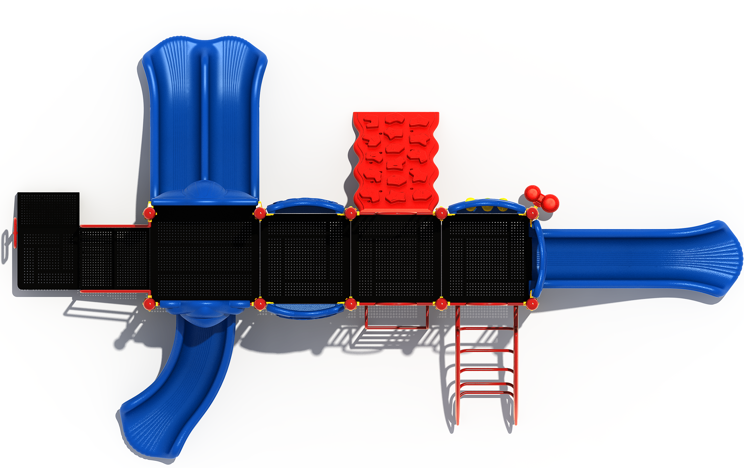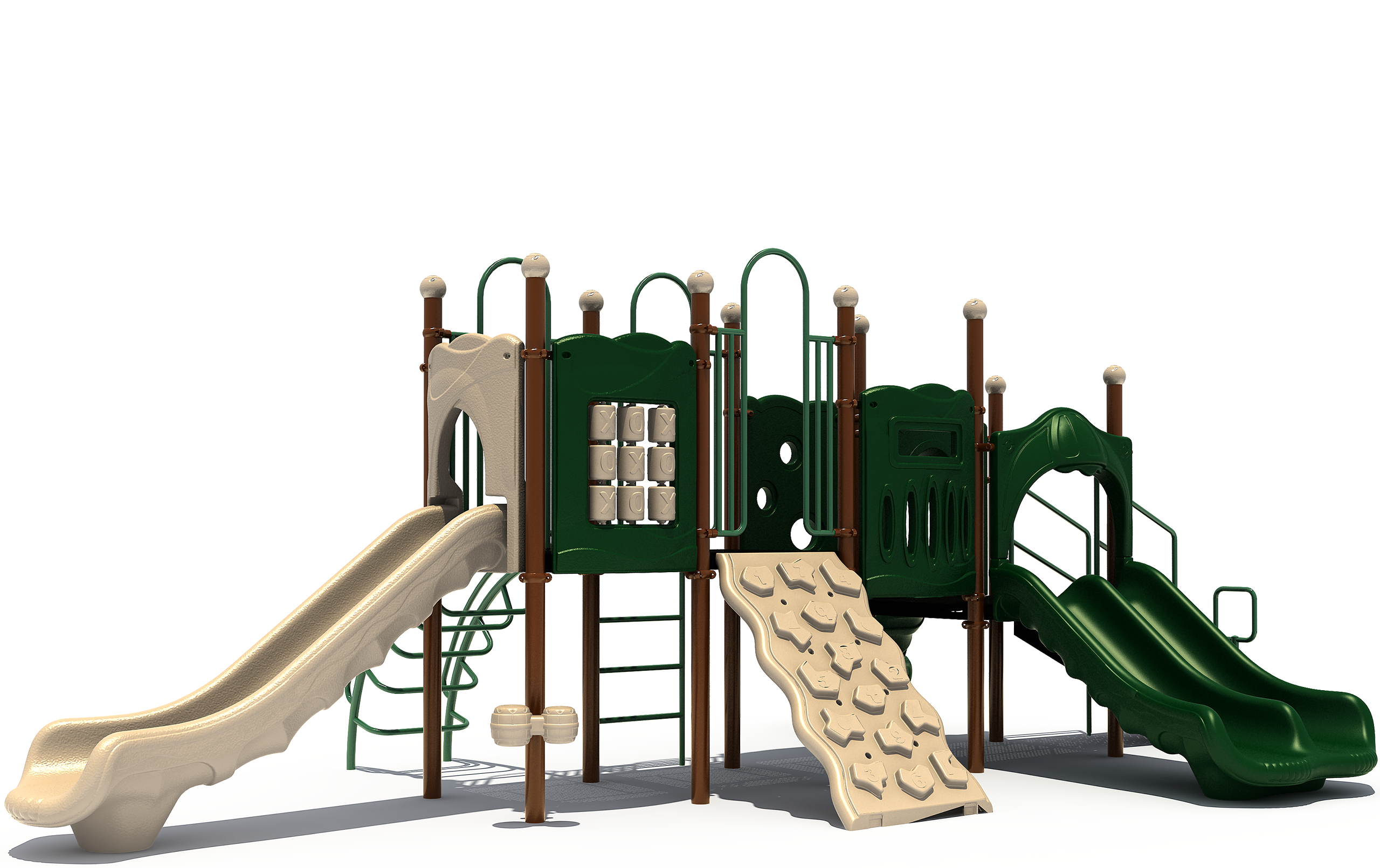 Prime Time is a mid sized playground that brings strong play value and variety to schools, churches, and community parks. Children can enjoy three different slide styles including a double slide, right turn slide, and straight slide which keeps the fun going with multiple ways to glide down from the deck. Climbing features such as the inverted arch climber, vertical challenge ladder, figure climber, and the accessible transfer station give kids several routes to reach the top and help support confidence and coordination. Interactive elements like the Tic Tac Toe panel and bongo drums encourage social play and group interaction. Prime Time offers a balanced mix of climbing, sliding, and hands on engagement in a space efficient design.